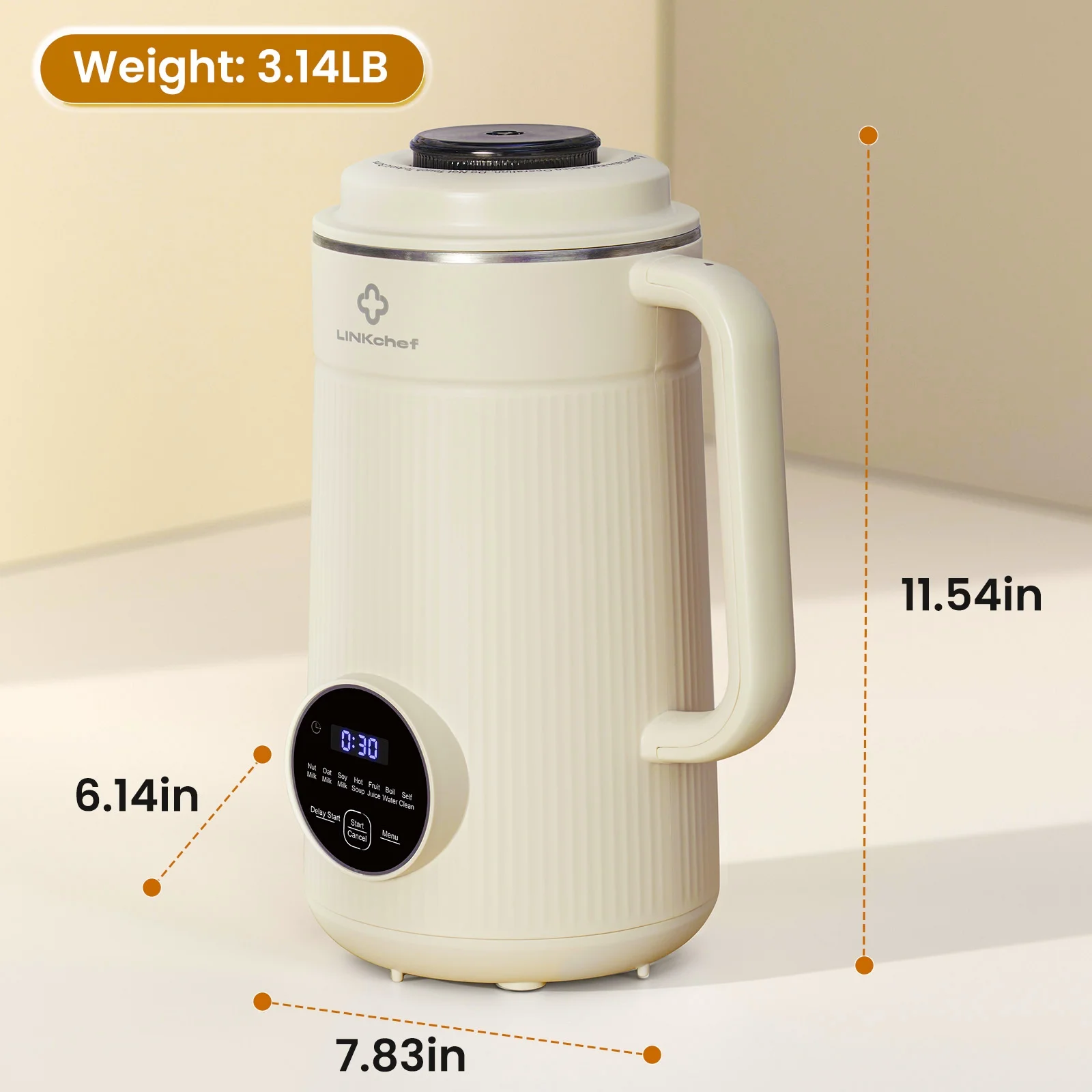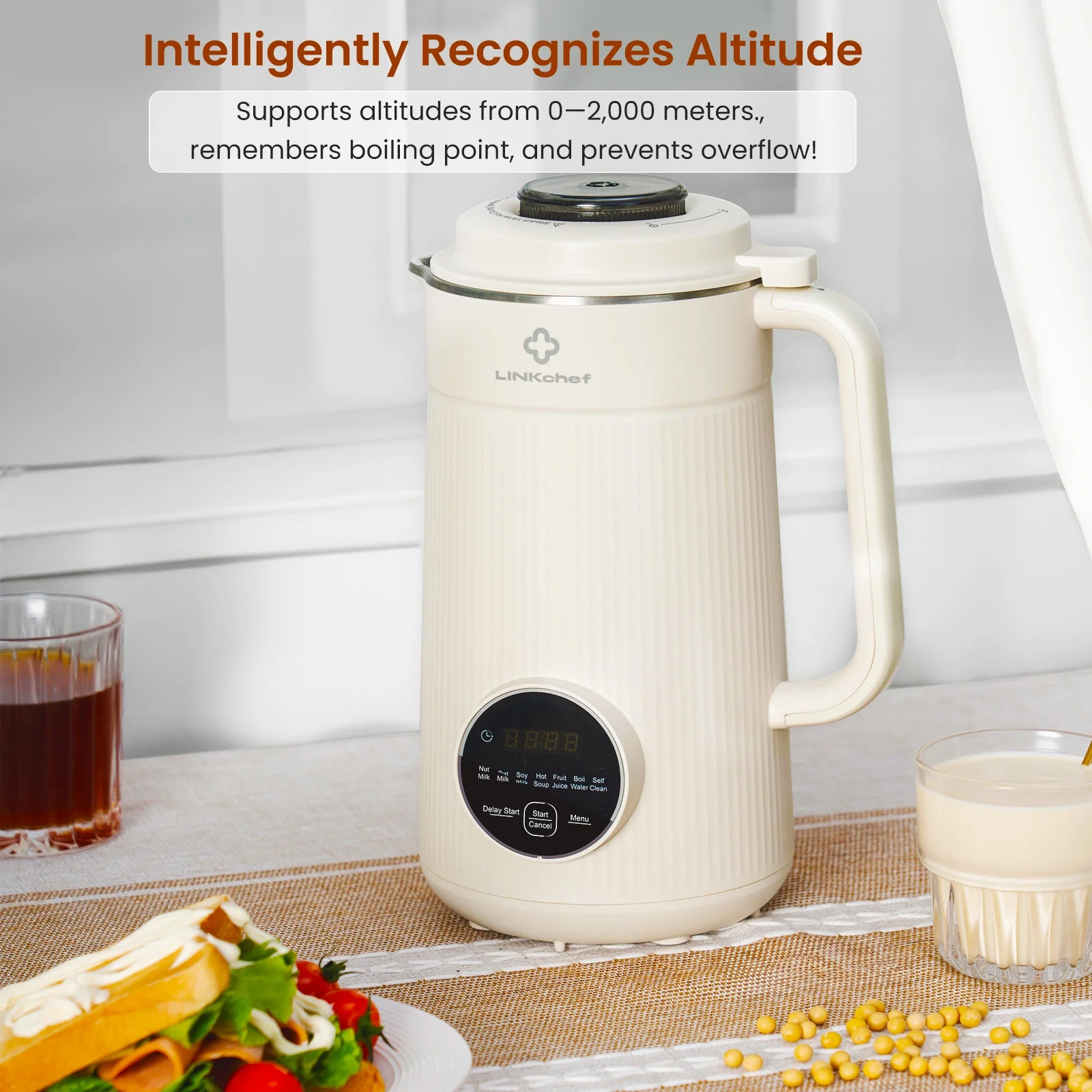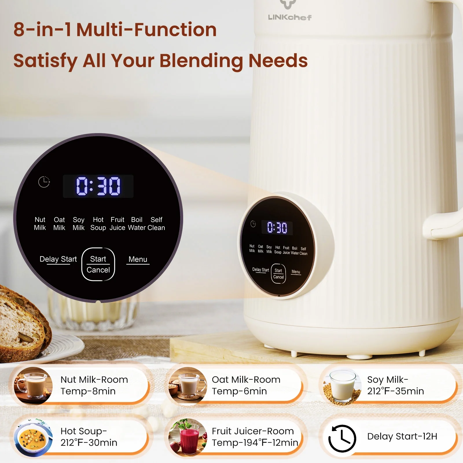 Convenient Scheduling: Features a 12-hour delay start for pre-setting and a 2-hour keep-warm function at 140°F (55°C) for soy milk or soup.
