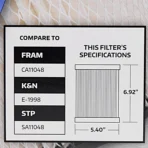 - Comparable Sizing: Equivalent in size to FRAM CA11048, K&N E-1998, and STP SA11048, with actual dimensions of 5.4 x 6.92 inches.