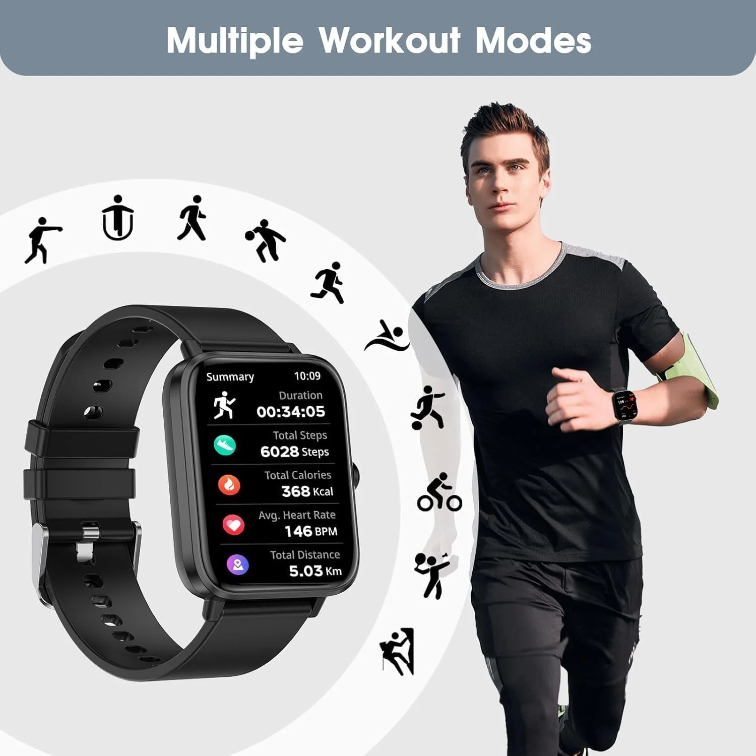 Smart App: Connects to a smart app for notification management, customizable watch faces, alarm settings, and detailed exercise logs.
